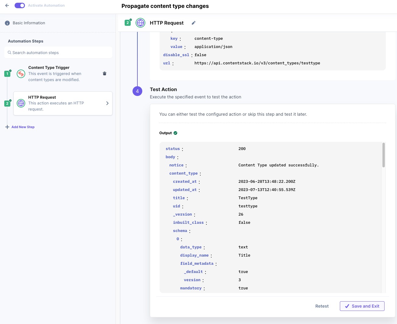 Ensure that the action is tested to capture the response payload. In this case, we expect two HTTP response codes. A 200 code indicates the content type already exists in the destination stack. A 422 code indicates if the content type cannot be found.