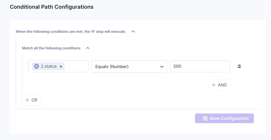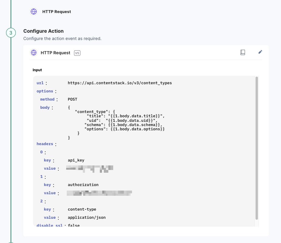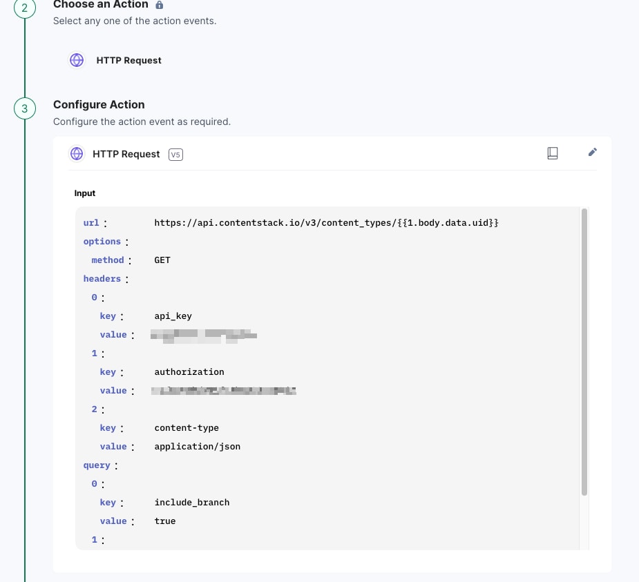 Ensure that the appropriate headers for the HTTP action are included, such as the api_key, authorization, content-type, and optionally, the include_branch. For security purposes, the credential information can be stored as Project Variables and referenced in the header value selection.