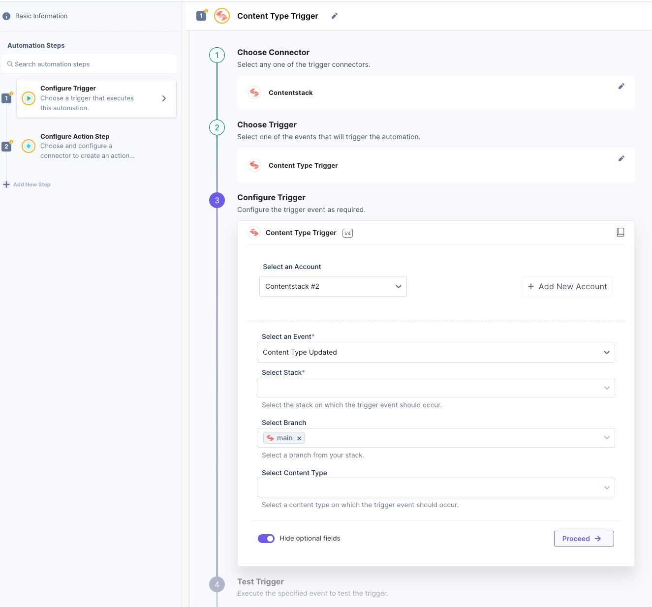 Create a new automation and select the Contentstack connector as the trigger. If you have not previously added an account, you can configure it by clicking Add New Account. Optionally, you can select the stack you want to replicate from and specify the content type for the trigger. If you leave the content type blank, then changes to all content types will trigger this automation.